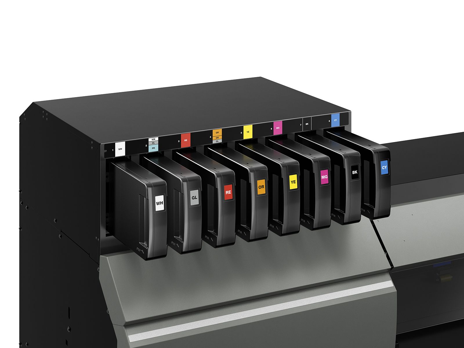 - Compatible con tintas ECO-UV EUV5 (Wh, Gl, Or, Re, Pr) y configuraciones ampliadas de hasta 8 colores.